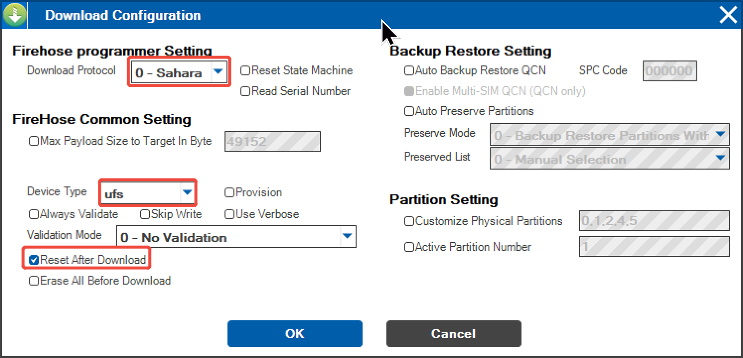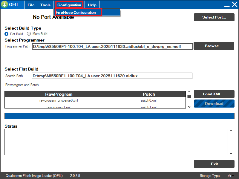 - 打开 QFIL ,点击上方 Configuration - FireHose Configuration 选项。