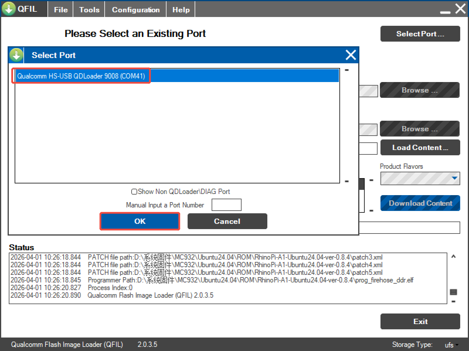 Select Port选项,在弹出的窗口,选择出现的9008端口,点击OK。经过切换到刷机模式章节中的切换,该窗口应该会自动出现9008端口,如未出现请断电重启后再次执行切换并等待其出现。