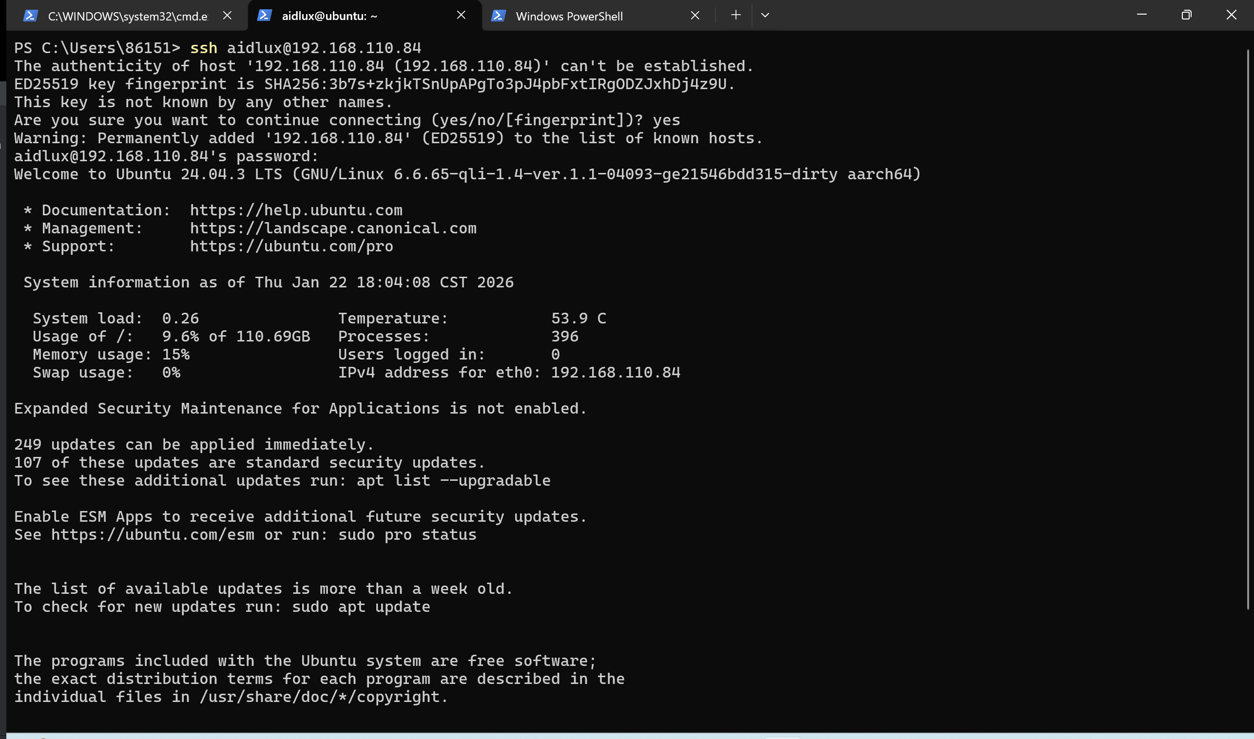 cmd,打开终端窗口,执行如下命令进行 SSH 连接。