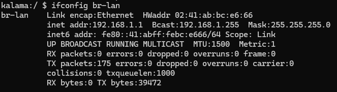 A8550PF1 的 3 路 LAN 口可以接入其他网络设备,例如 IPC ,雷达等等。接入后会自动为下联设备分配 192.168.1.x/24 网段的 IP 地址,网关地址为:192.168.1.1。系统的网桥接口为 br-lan,如下图: